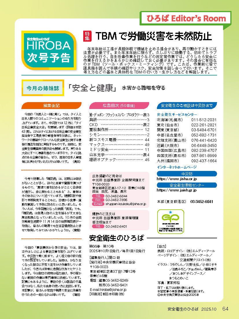 マンガポスターのデータの活用にあたって:「DLして使おう! マンガポスター」のイラストは、安全・健康に関する社内啓発用資料等の作成にご活用ください。ご使用の際は出典を明記してください(例:「安全衛生のひろば」(中災防)2025 年10月号から転載)。なお、商業利用、画像加工をしての使用はできません。