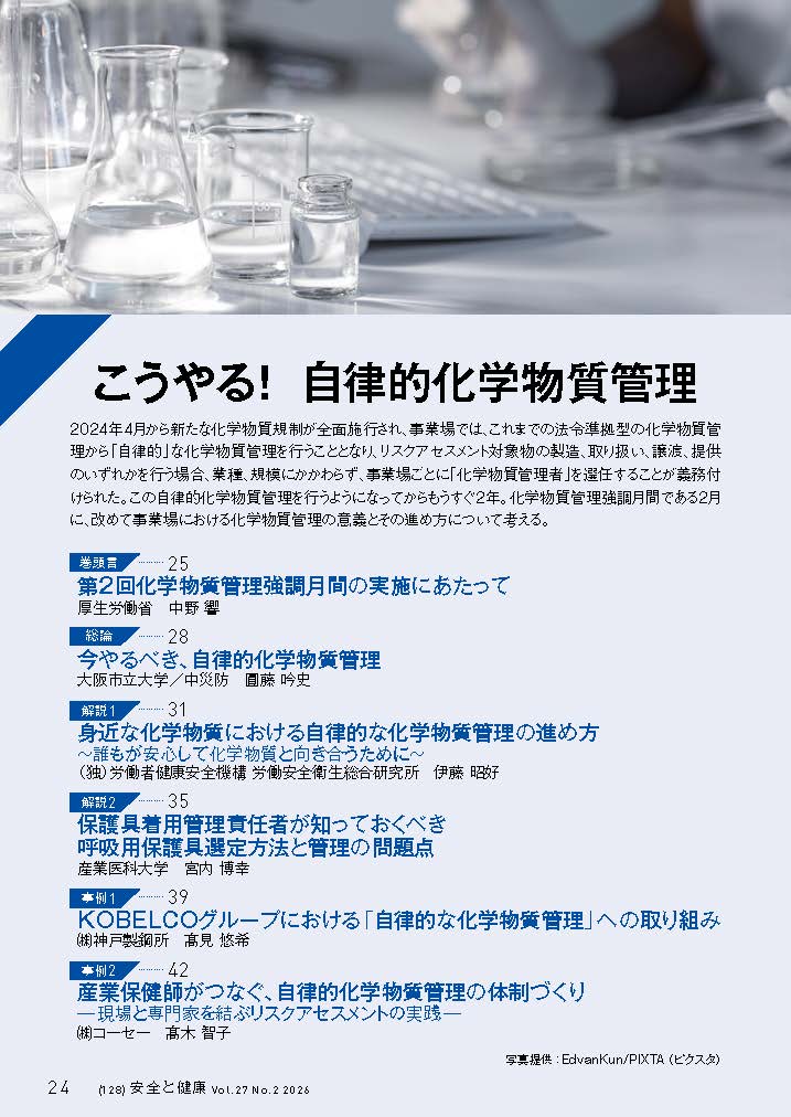 2024年4月から新たな化学物質規制が全面施行され、事業場では、これまでの法令準拠型の化学物質管理から「自律的」な化学物質管理を行うこととなり、リスクアセスメント対象物の製造、取り扱い、譲渡、提供のいずれかを行う場合、業種、規模にかかわらず、事業場ごとに「化学物質管理者」を選任することが義務付けられた。この自律的化学物質管理を行うようになってからもうすぐ2年。化学物質管理強調月間である2月に、改めて事業場における化学物質管理の意義とその進め方について考える。