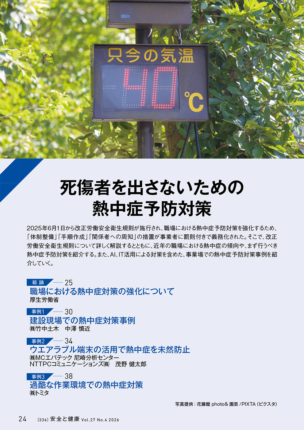 2025年6月1日から改正労働安全衛生規則が施行され、職場における熱中症予防対策を強化するため、「体制整備」「手順作成」「関係者への周知」の措置が事業者に罰則付きで義務化された。そこで、改正労働安全衛生規則について詳しく解説するとともに、近年の職場における熱中症の傾向や、まず行うべき熱中症予防対策を紹介する。また、AI、IT活用による対策を含めた、事業場での熱中症予防対策事例を紹介していく。