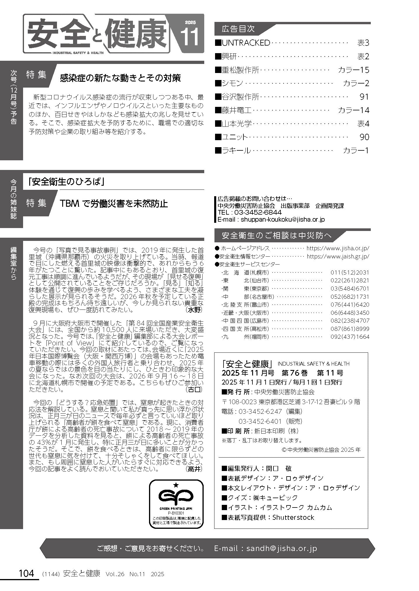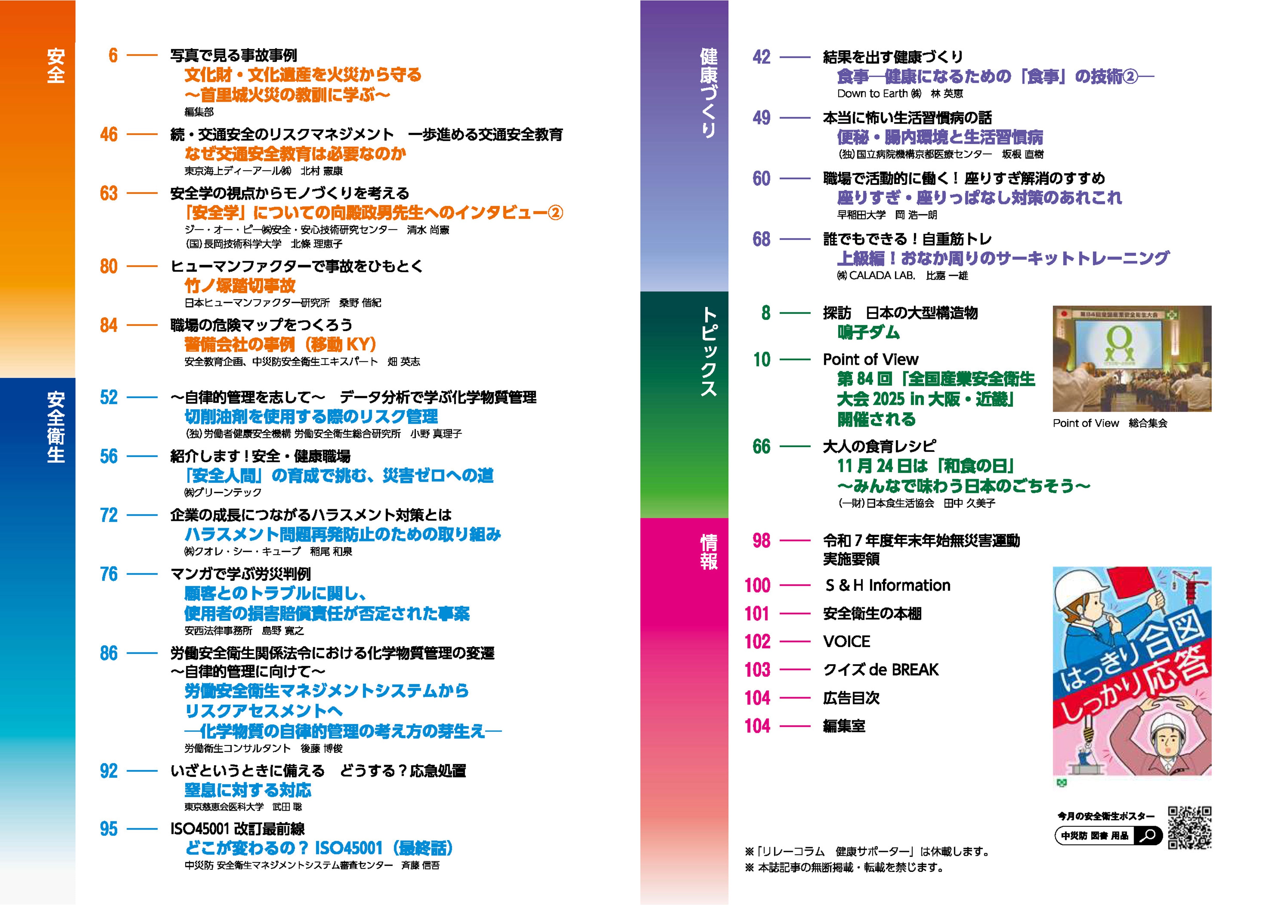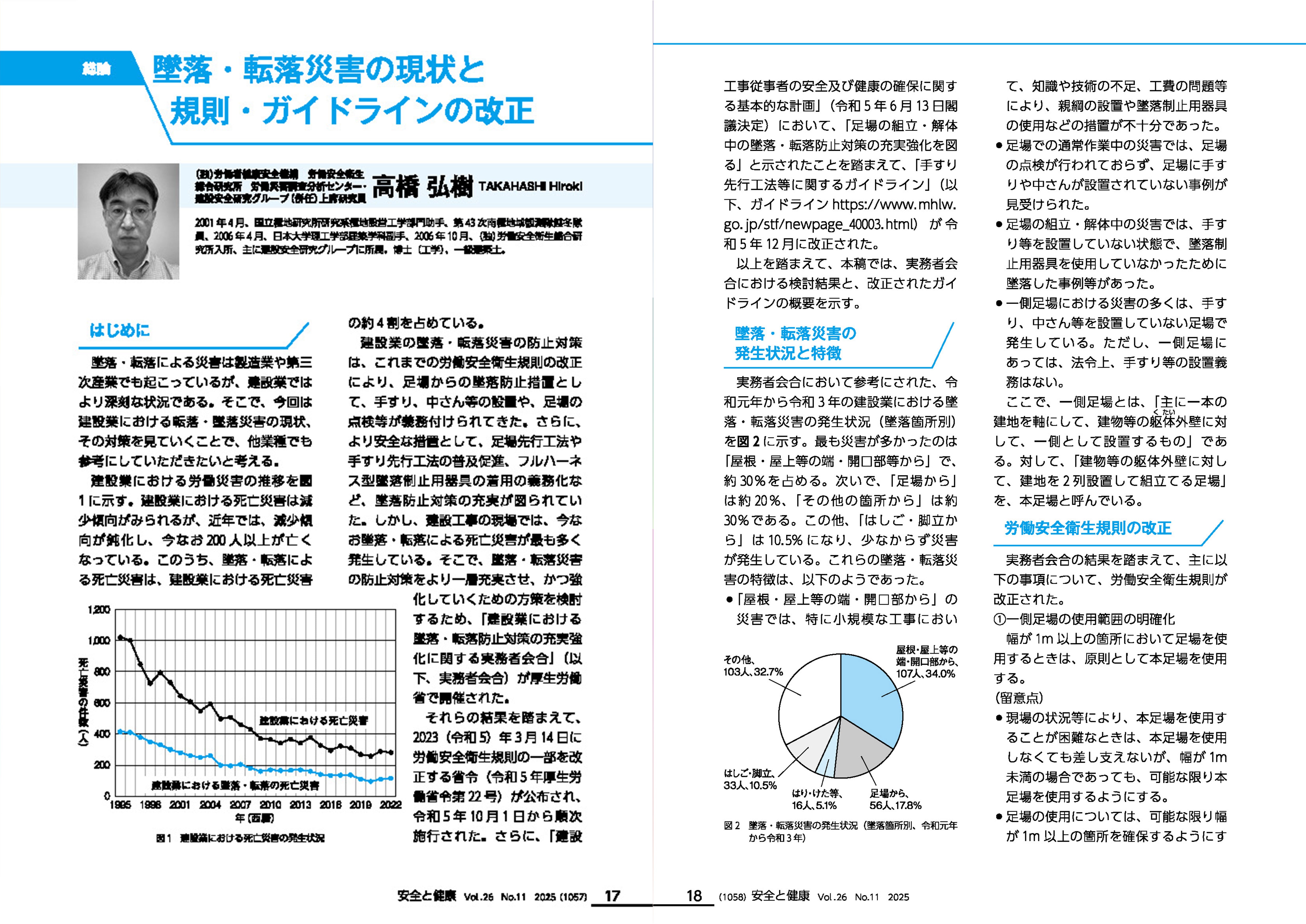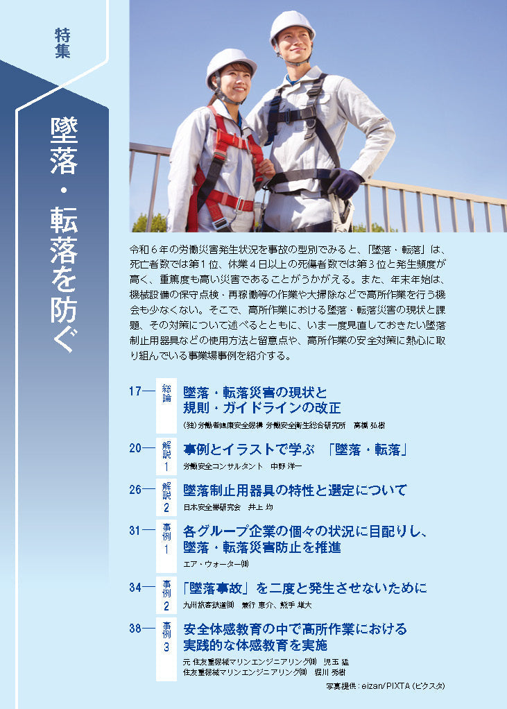 令和6年の労働災害発生状況を事故の型別でみると、「墜落・転落」は、死亡者数では第1位、休業4日以上の死傷者数では第3位と発生頻度が高く、重篤度も高い災害であることがうかがえる。また、年末年始は、機械設備の保守点検・再稼働等の作業や大掃除などで高所作業を行う機会も少なくない。そこで、高所作業における墜落・転落災害の現状と課題、その対策について述べるとともに、いま一度見直しておきたい墜落制止用器具などの使用方法と留意点や、高所作業の安全対策に熱心に取り組んでいる事業場事例を紹介する。