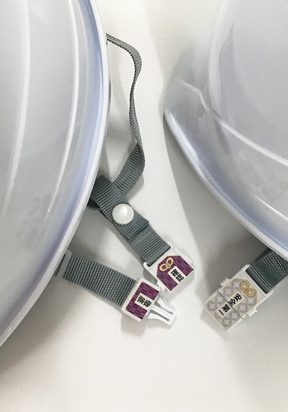 保護帽のあご紐フックに本製品を貼り、フックを正しくはめることでお守りが完成します。