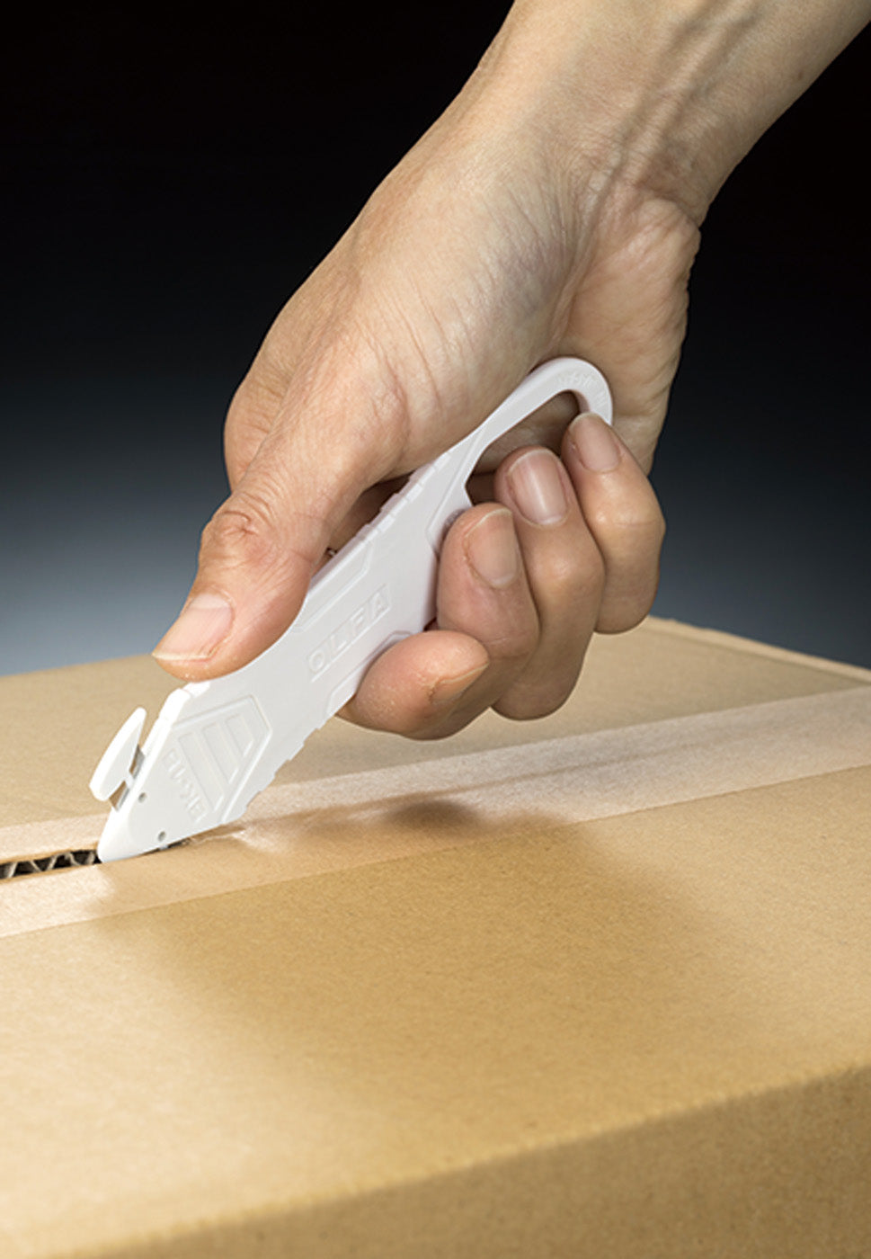刃に指が触れにくい、安心設計の開梱用カッター
